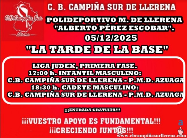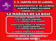 El próximo fin de semana, con motivo del puente, no hay competición. Sí jugarán los partidos aplazados, de la cuarta jornada de la temporada, nuestros equipos MASCULINOS de la BASE, en JUDEX-FEXB. Será la tarde del viernes 5 de diciembre de 2025, en "LA TARDE DE LA BASE" en el "ALBERTO PÉREZ". ¡NO FALTÉIS!