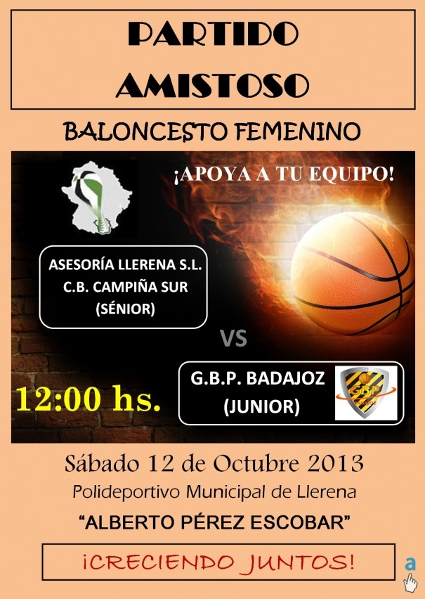 Mañana sábado 12 de octubre a las 12:00 hs., el equipo sénior femenino del "campiña" jugará partido amistoso en el Pabellón Municipal de Llerena "Alberto Pérez Escobar", frente al G.B.P. de Badajoz. Segundo partido amistoso de pretemporada de las "llerenitas", contra un rival de muchísima calidad, que el año pasado contabilizó sus partidos por victorias.