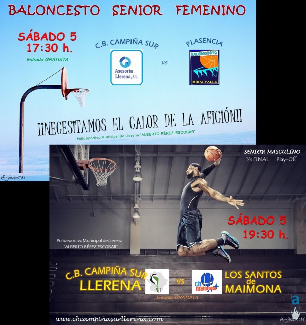 A las 19:30 hs., partido importantísimo de nuestros seniors, C.B.CAMPIÑA SUR DE LLERENA-C.B. MAIMONA. Enfrente, nuestros amigos de Los Santos. Segundo partido de cuartos de final, en el que una victoria nos mete directamente en la Final a 4 del Trofeo Diputación de Badajoz. Después de ganar en la pista de los de Maimona, el factor cancha cobra vital importancia, y ahí jugará un papel muy importante el público.