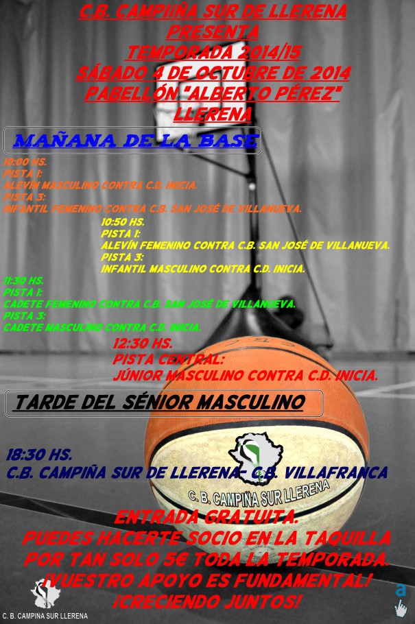El C.B. Campiña Sur anima a todos los familiares y amigos de los jugadores, y a los aficionados al baloncesto a acercarse para así apoyar a la base y a nuestro equipo sénior. Asimismo, en la taquilla del pabellón, podrán hacerse socio del club, por tan solo 5 €, por toda la temporada 2014/15.