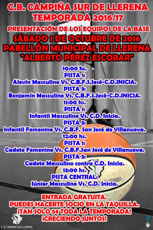 La mañana del sábado 1 de octubre de 2016, tendrá lugar la puesta de largo de todos los equipos de la cantera del C.B. CAMPIÑA SUR DE LLERENA. Será en el Pabellón Municipal "ALBERTO PÉREZ", de Llerena. Como es ya tradición, los equipos invitados para dicha presentación, serán nuestros amigos del C.D. INICA y el C.B.F. SAN JOSÉ. Agradecerles su participación. El horario de partidos y pista, es el siguiente: