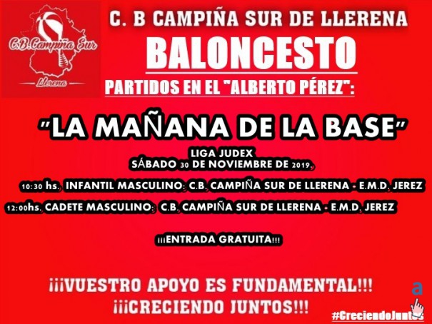EL PRÓXIMO SÁBADO 30 DE NOVIEMBRE, "LA MAÑANA DE LA BASE" EN EL ALBERTO PÉREZ. EL SÉNIOR MASCULINO ASESORÍA LLERENA, S.L. Y TRASUR,S.L.-TRACTORES KUBOTA", JUEGA FUERA DE CASA. Y LOS EQUIPOS BENJAMINES, DISFRUTARÁN DE LA PRIMERA CONVIVENCIA DE MINIBÁSKET.