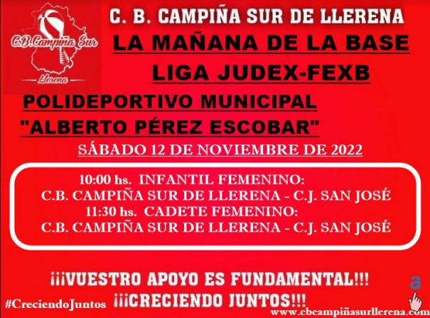 El próximo sábado 12 de noviembre de 2022, juegan partidos de la liga regular JUDEX-FEXB nuestros equipos de la BASE que compiten. Los equipos masculinos infantil, cadete y júnior, jugarán en la pista del E.M.D. JEREZ DE LOS CABALLEROS. Nuestras infantiles y cadetes, jugarán "LA MAÑANA DE LA BASE" en el Pabellón Municipal de Llerena "ALBERTO PÉREZ". ¡¡¡OS ESPERAMOS!!!