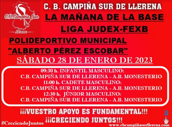 El próximo fin de semana, juegan  nuestros equipos de la BASE que compiten en JUDEX-FEXB. Los equipos FEMENINOS, INFANTIL y CADETE, la tarde del viernes, jugarán en la pista del COLEGIO SAN JOSÉ.  Los equipos MASCULINOS INFANTIL, CADETE y JÚNIOR jugarán "LA MAÑANA DE LA BASE" en el Pabellón Municipal de Llerena "ALBERTO PÉREZ".  Esperamos, unas gradas repletas de aficionados y, como siempre, animando con DEPORTIVIDAD.