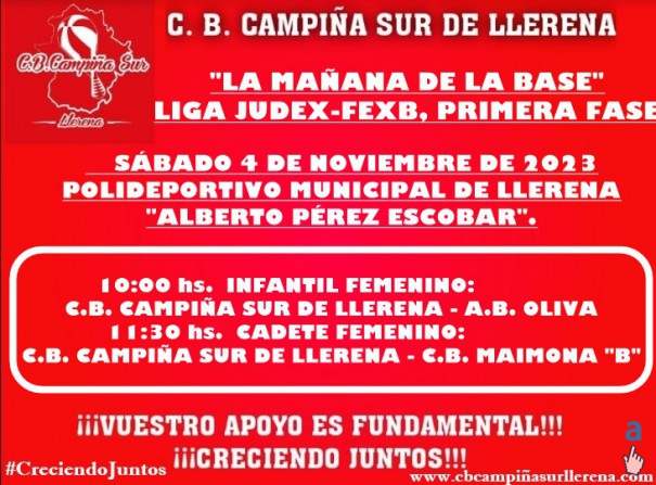 El próximo fin de semana juegan partidos de la PRIMERA FASE de la liga JUDEX-FEXB nuestros equipos de la BASE que compiten. Los equipos INFANTIL y JÚNIOR MASCULINOS, jugarán la tarde del viernes 3 de noviembre de 2023 en la pista de A.B. MONESTERIO. Los equipos INFANTIL y CADETE FEMENINOS, jugarán el sábado "LA MAÑANA DE LA BASE" en el Polideportivo Municipal de Llerena "ALBERTO PÉREZ ESCOBAR". ¡¡¡OS ESPERAMOS!!!