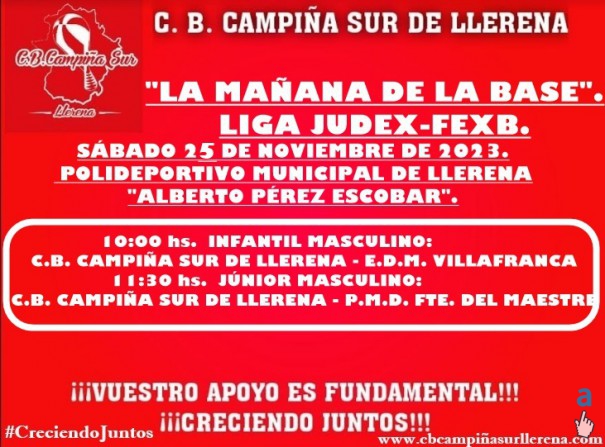 El próximo fin de semana juegan partidos de la liga regular JUDEX-FEXB nuestros equipos de la BASE que compiten. Los equipos INFANTIL y CADETE FEMENINO, jugarán la mañana del domingo 26 de noviembre de 2023 en la pista de E.M.D. Jerez de los Caballeros. Los equipos INFANTIL y JÚNIOR MASCULINO, jugarán el sábado "LA MAÑANA DE LA BASE" en el Polideportivo Municipal de Llerena "ALBERTO PÉREZ". ¡¡¡OS ESPERAMOS!!!