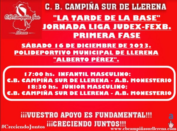 El próximo fin de semana juegan los últimos partidos del 2023 de la liga regular JUDEX-FEXB nuestros equipos de la BASE que compiten. Los equipos INFANTIL y CADETE FEMENINOS, jugarán la mañana del sábado 16 de diciembre de 2023 en la pista de A.B. OLIVA y C.B. MAIMONA "B", respectivamente.. Los equipos INFANTIL y JÚNIOR MASCULINOS, jugarán el sábado "LA TARDE DE LA BASE" en el Polideportivo Municipal de Llerena "ALBERTO PÉREZ". ¡¡¡OS ESPERAMOS!!!