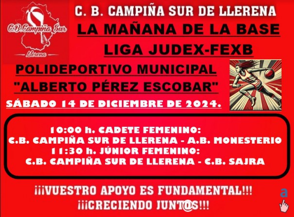 El próximo fin de semana, se juega la octava jornada para nuestros equipos de la BASE que compiten en JUDEX-FEXB. Será la última jornada del 2024. Nuestros equipos MASCULINOS INFANTIL, CADETE y JÚNIOR, jugarán fuera de casa. Los INFANTILES juegan la tarde del viernes en la pista de A.B. OLIVA y, la mañana del sábado en la pista del E.M.D. JEREZ DE LOS CABALLEROS, lo harán CADETES y JUNIORS.. Nuestros equipos FEMENINOS CADETE y JÚNIOR FEMENINO, juegan la mañana del SÁBADO 14 DE DICIEMBRE DE 2024 en el "ALBERTO PÉREZ". Nuestro INFANTIL FEMENINO descansa.