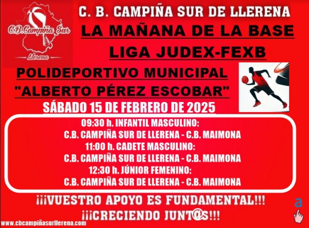 El próximo fin de semana jugarán partidos de la liga regular JUDEX-FEXB nuestros equipos de la BASE que compiten. Los equipos INFANTIL y CADETE FEMENINO jugarán la mañana del sábado en la pista del COLEGIO JESUITAS SAN JOSÉ. El JÚNIOR FEMENINO, jugará la mañana del domingo en la pista del C.B. SAJRA. Los equipos INFANTIL, CADETE y JÚNIOR MASCULINO, jugarán el sábado 15 de febrero de 2025 "LA MAÑANA DE LA BASE" en el Polideportivo Municipal de Llerena "ALBERTO PÉREZ".