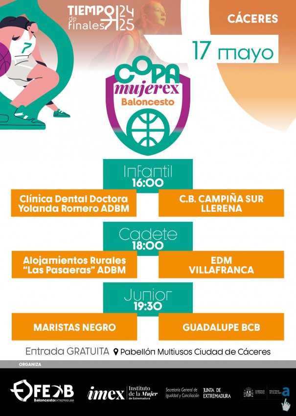 Nuestro equipo INFANTIL FEMENINO...¡CLASIFICADO PARA LA FINAL DE LA COPA MUJEREX! Fantástica temporada de las nuestras, con la guinda de la clasificación para la final. El pasado domingo en el "ALBERTO PÉREZ", jugaron la SEMIFINAL COPA MUJEREX frente a C.B. AL-QÁZERES A.D.C. Magnífico ambiente en la grada, con numerosos aficionados y familiares. Agradecemos desde el club, el ánimo y el apoyo de todos y todas, en una tónica general de RESPETO Y DEPORTIVIDAD. Partido que se resolvió en la prórroga, 47-41. Enhorabuena a las nuestras por la victoria y el pase a la final. Ánimo a las visitantes, y enhorabuena por la temporada. La FINAL COPA MUJEREX frente a A.D. MONTEHERMOSO, se jugará el próximo sábado 17 de mayo, a las 16:00 h. en el PABELLÓN MULTIUSOS DE CÁCERES. Genial ambiente el que se prevé, con un autobús "fletado" por las familias para ir a animar a nuestras jugadoras. ¡¡¡CRECIENDO JUNT@S!!!