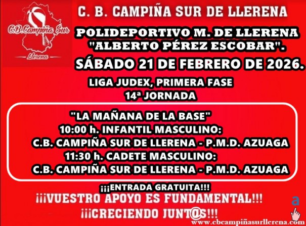 Nueva jornada de la temporada para nuestros equipos de la BASE que compiten en JUDEX-FEXB. Nuestros equipos FEMENINOSINFANTIL y JÚNIOR,  jugarán respectivamente la mañana del sábado en la pista del C.B. MAIMONA y la tarde del viernes en la pista de EL TEMPLO EVENTOS B.B. BADAJOZ.  Nuestros equipos MASCULINOS INFANTIL Y CADETE, juegan "LA MAÑANA DE LA BASE" el SÁBADO 21 DE FEBRERO DE 2026 en el "ALBERTO PÉREZ". ¡NO FALTÉIS!