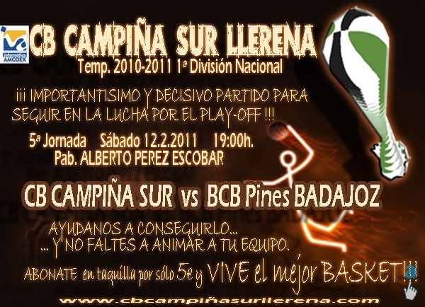 El próximo sábado 12 el CAMPIÑA se enfrenta a BCB Pines Badajoz, en un choque importantísimo para ambos equipos, casi definitivo en el caso de los llerenenses, en la lucha por engancharse a los puestos de play-off. El equipo de Moncho Galavis conseguía el pasado sábado en Las Palmeras su primera victoria de la temporada, incluida la Copa, por lo que llegara con la moral alta siendo un equipo mucho mas competitivo y compacto de lo visto hasta el momento lo que les convierte en un difícil rival.